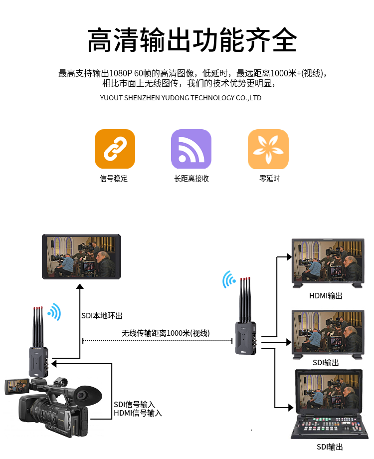 YD-TQ1000-DS是由發(fā)射端和接收端組成,支持3G/HD/SD-SDI或者HDMI 1080P全高清信號(hào)傳輸,作為圖傳時(shí),視線無阻擋傳輸距離1000至1500米。頻段采用5.1-5.8GHz,支持用戶手動(dòng)通信頻點(diǎn)調(diào)整,為發(fā)射端和接收端配對(duì),還支持廣播模式,可以把多個(gè)接收端設(shè)置成跟一個(gè)發(fā)射端相同的頻點(diǎn),實(shí)現(xiàn)一發(fā)多收。純硬件連接操作,簡(jiǎn)單可靠。設(shè)計(jì)精巧,可以F970 、V口、 電源適配器三種供電方式,方便移動(dòng)拍攝。廣泛應(yīng)用于電影拍攝、應(yīng)急搶險(xiǎn)、消防、人防、武警、突發(fā)事故單兵視頻采集等場(chǎng)合;真正實(shí)現(xiàn)高清無線傳輸、移動(dòng)實(shí)時(shí)傳輸、