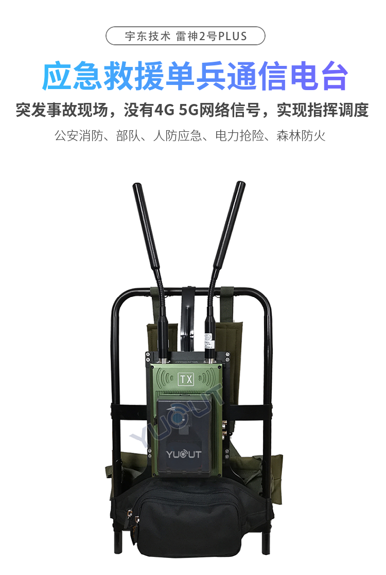 宇東技術雷神2號plus背負式高清無線圖傳電臺,是公司針對應急救援指揮、公安、反恐作戰、消防救援、邊防執勤、海警海關巡檢、部隊拉練演習、森林消防等,在突發重大事件,斷網斷電,通信中斷的情況下,現場工作人員通過宇東雷神系列單兵圖傳電臺,把現場采集的數據實時無線傳輸到指揮車/臨時指揮部大屏幕,讓指揮部領導對現場情況一目了然,節省了到達現場的時間,可快速做緊急指揮調度,最大限度的減少突發事件帶來的各種損失,宇東雷神2號plus單兵電臺支持雙向語音對講系統,現場工作人員可以和指揮部通話,接受領導發送的各種指令。