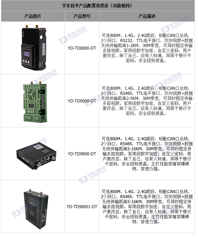 YD-TD9800-DT低時延無線圖傳系統(tǒng),采用工業(yè)級無線高速跳頻傳輸技術(shù),非視距,非WIFI,集合正交頻分復(fù)用時分多址調(diào)制及MIMO多進(jìn)多出容量技術(shù),完全基于IP互聯(lián)網(wǎng)協(xié)議,將信道資源在時間上通過時隙、頻率上通過子載波來靈活分配給多個用戶,在單一頻率點(diǎn)最大限度的提供多用戶接入,完全實(shí)現(xiàn)雙向透明通道傳輸。通道最大支持30Mbps吞吐量,視距可傳輸:10-18公里。系統(tǒng)為純硬件連接,即插即用;創(chuàng)新性液晶一體化設(shè)計(jì)、豐富的CAN總線、RS-232、TTL電平接口,更好的用戶角度體驗(yàn)。且系統(tǒng)具有很強(qiáng)的抗多徑干擾能力,克服模擬技術(shù)和常規(guī)調(diào)制技術(shù)下多徑反射及遮擋所帶來的困擾,實(shí)現(xiàn)在復(fù)雜的環(huán)境下多點(diǎn)傳輸數(shù)據(jù)、視頻、音頻。可廣泛應(yīng)用于工業(yè)自動化、工業(yè)機(jī)器人、無人機(jī)等通信工作。